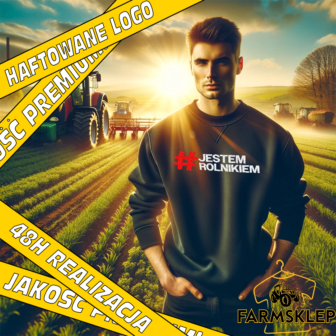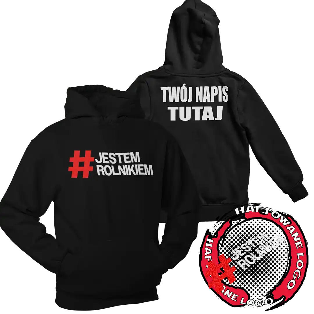Bluza dla rolnika #JESTEM ROLNIKIEM z haftowanym dużym logo na przodzie z możliwością dodania własnego napisu na tyle. Własny napis też jest wykonany w technologii haftu komputerowego.