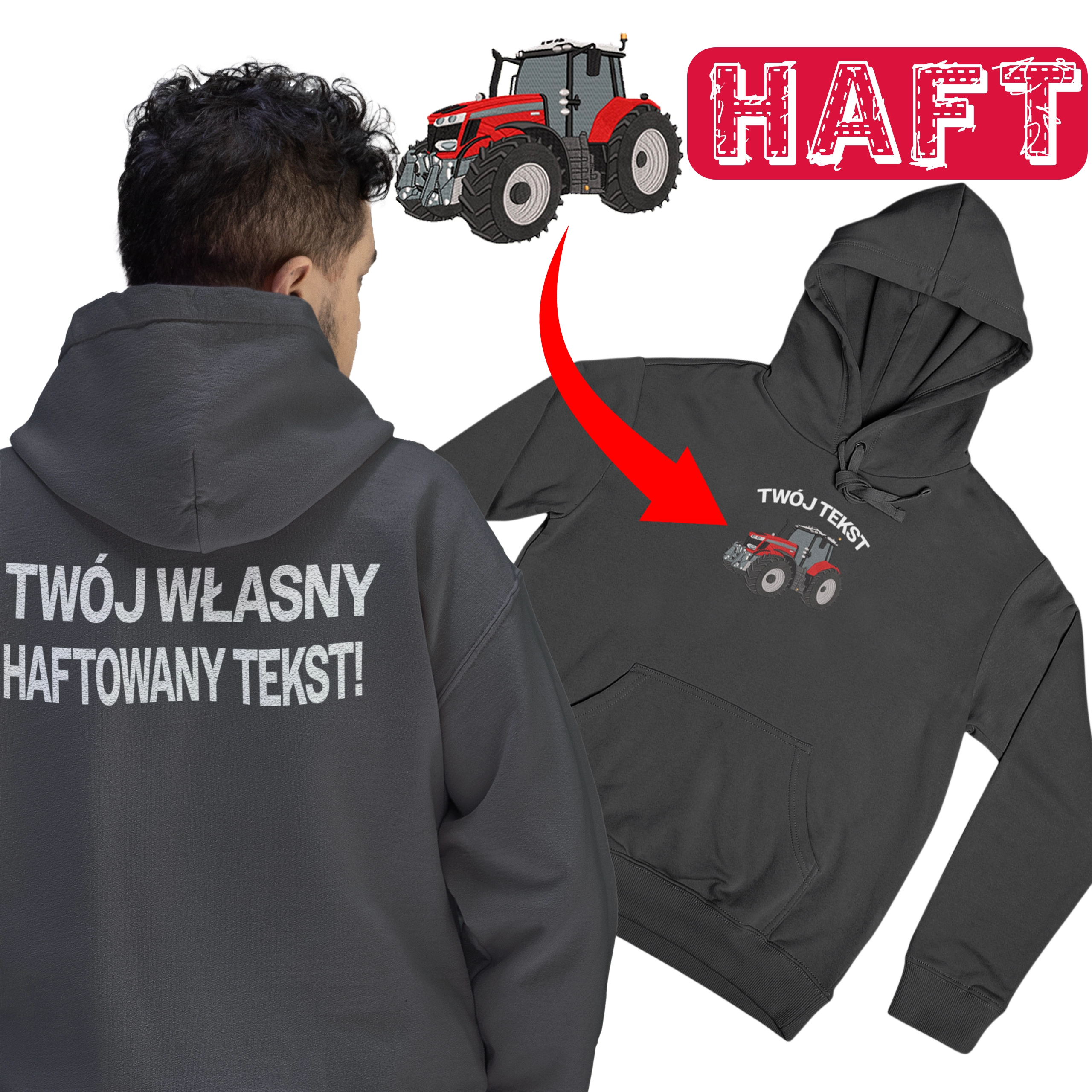 Idealna propozycja dla właścicieli, sympatyków marki fendt. Haft wykonany jest na środku, jego wymiar to ok 12cm szerokości, wysokość jest proporcjonalna. Dodaj własny haft na przodzie jak i na tyle bluzy. Bluza jest w pełni personalizowana. Stwórz bluzę z własnym haftem na tyle oraz przodzie. Haft na bluzie dodaje prestiżu oraz czyni ją niezniszczalnym.