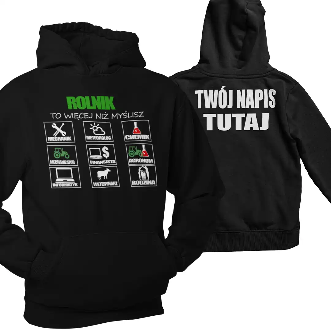Bluza dla rolnika „Rolnik to więcej niż myślisz” + możliwy własny napis/nazwa gospodarstwa/imię na plecach za dopłatą. By dodać własny napis wpisz go w polu wyżej i zaznacz opcję własny napis na plecach na tak 🙂.