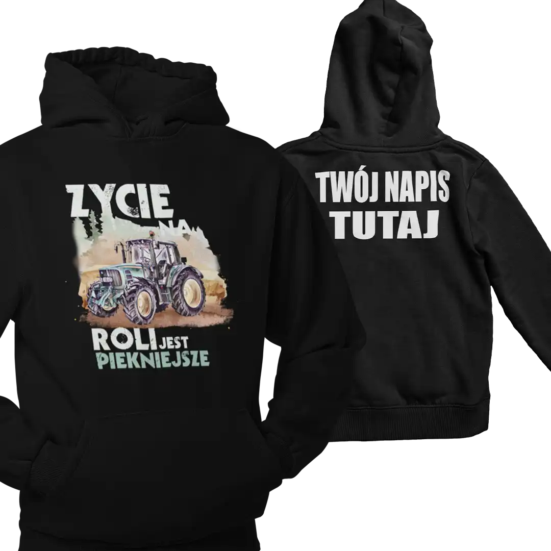 Bluza z kapturem lub bez dla rolnika „ŻYCIE NA ROLI JEST PIĘKNIEJSZE” + możliwy własny napis/nazwa gospodarstwa/imię na plecach za dopłatą. By dodać własny napis wpisz go w polu wyżej i zaznacz opcję własny napis na plecach na tak 🙂. Do wyboru bluza z kapturem JD, bluza bez kaptura JD.