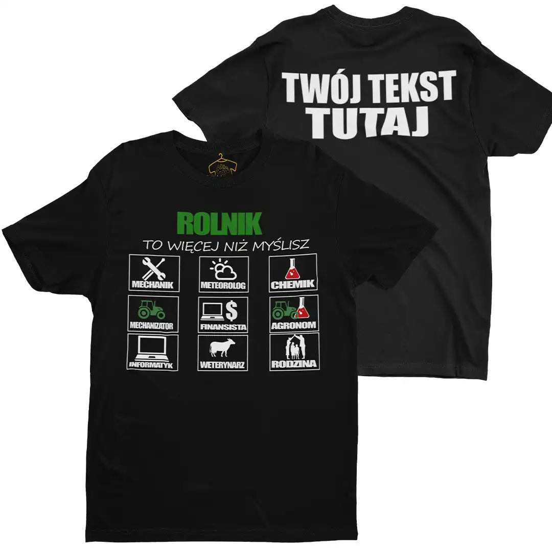 Koszulka dla rolnika rolnik to więcej niż myślisz + możliwy własny napis/nazwa gospodarstwa/imię na plecach za dopłatą. By dodać własny napis wpisz go w polu wyżej i zaznacz opcję własny napis na plecach na tak .