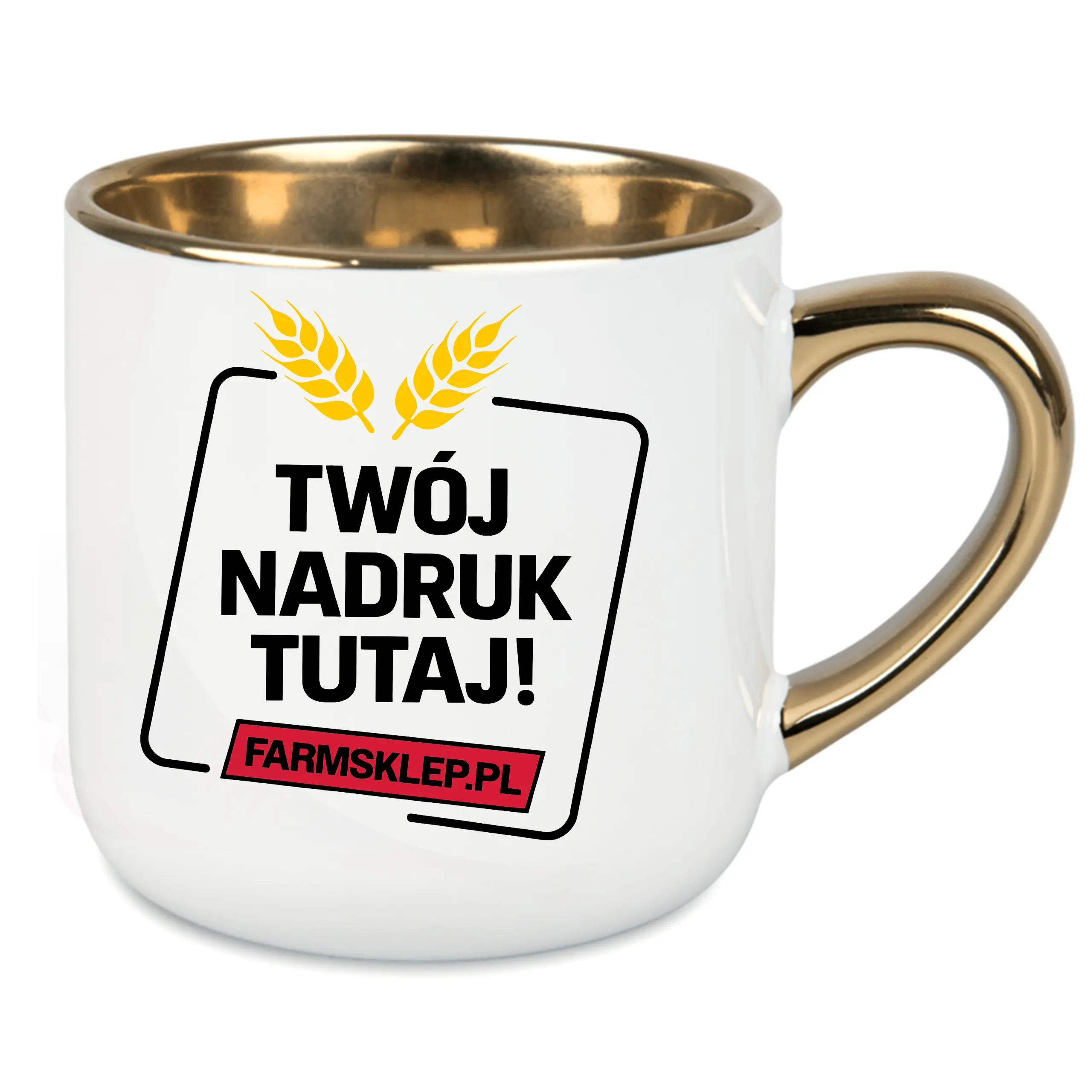 Kliknij „Personalizuj” i zaprojektuj elegancki kubek ze złotym uszkiem i własnym nadrukiem.
