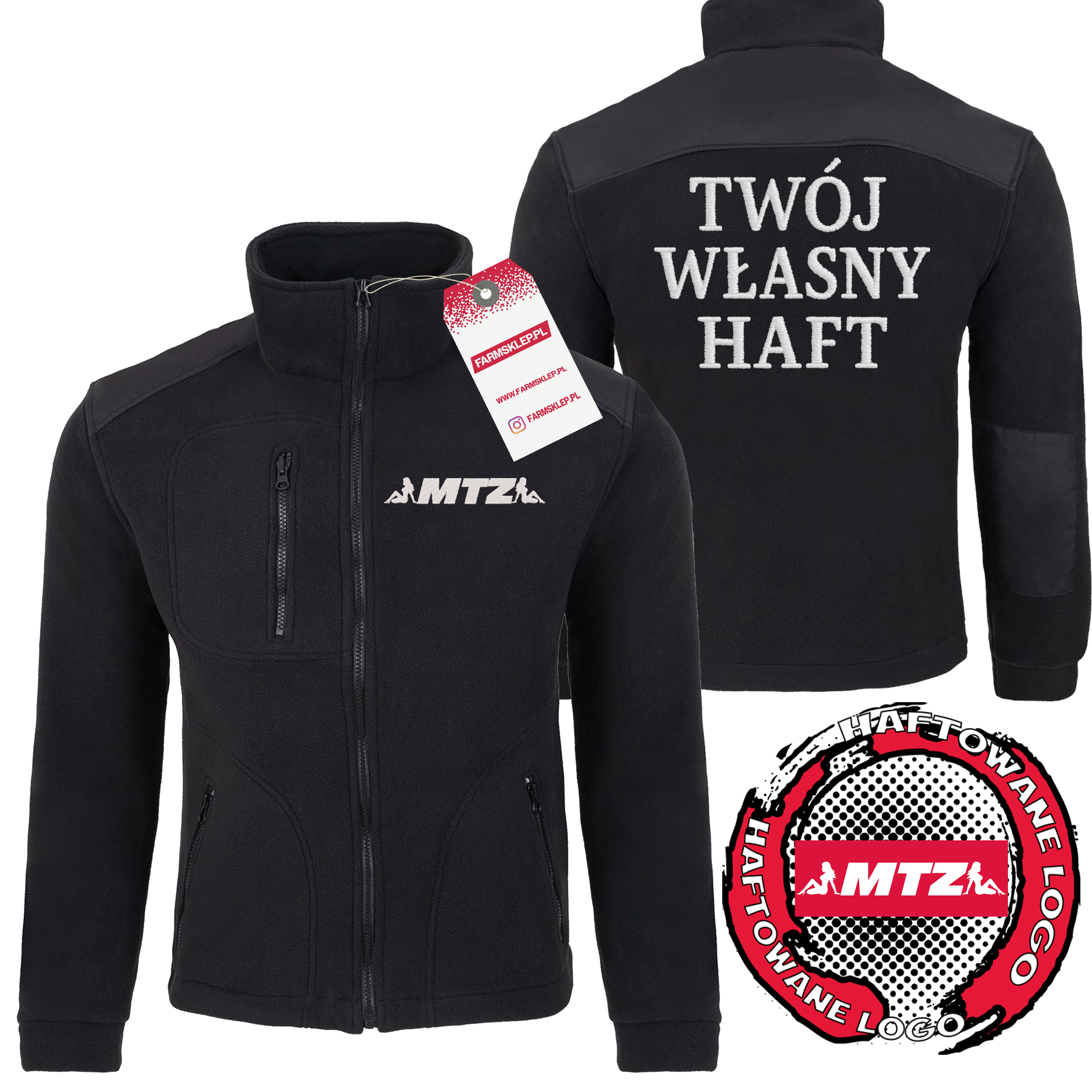 Ciepły wysokiej jakości Polar MTZ leady z HAFTOWANYM LOGO + możliwy własny napis/nazwa gospodarstwa/firmy/imię na plecach. Własny nadruk jest również wyhaftowany! By dodać własny napis wpisz go w polu wyżej i zaznacz opcję własny napis na plecach na tak.